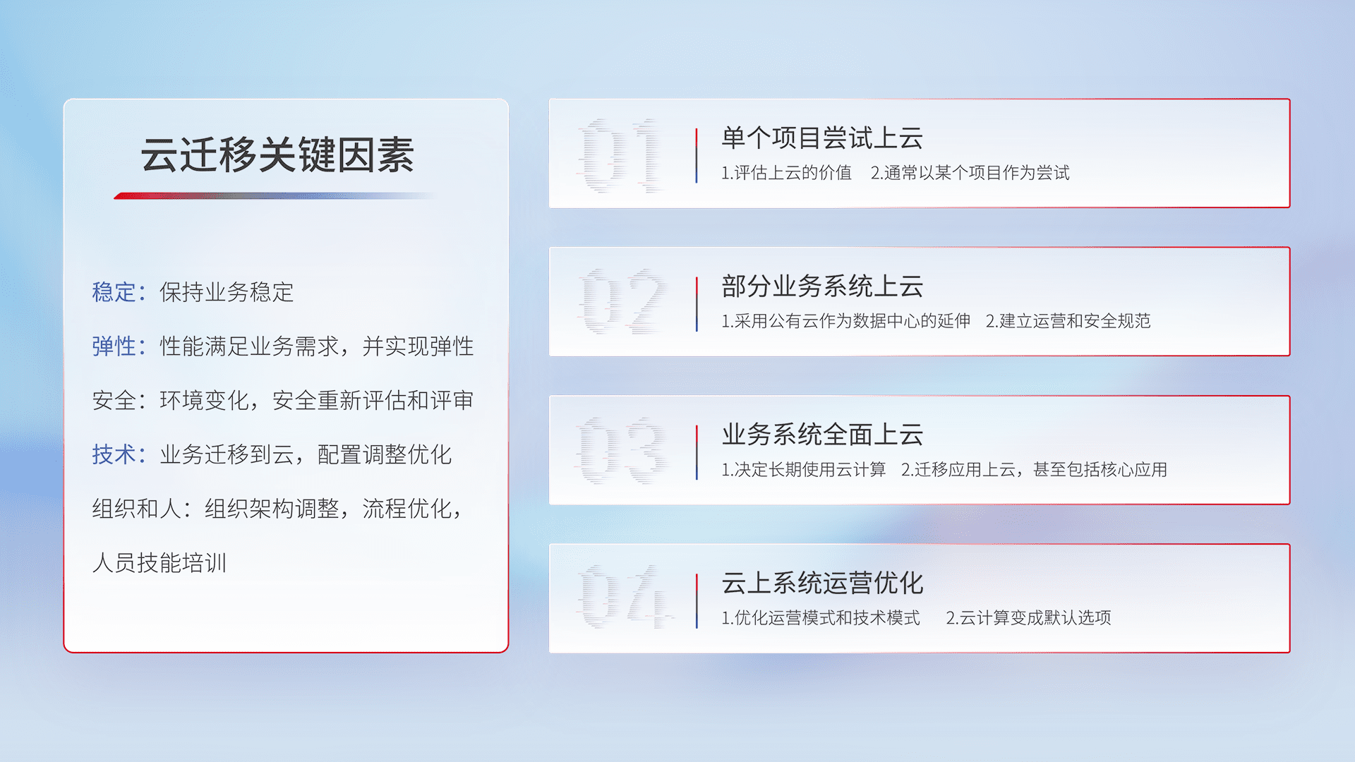 结合实际业务,,,从规划设计、、云平台选型、、云原生改造、、、、数据迁移、、、集成交付,,,,迁移全过程为客户识别最佳上云路径,,,,做好风险识别管理,,,,设计网络架构、、、身份权限、、、安全审计合规、、、操作审计、、日志审计、、、监控告警策略、、、多站点容灾设计等,,对云上基础设施进行整体规划,,,,提升IT治理水平,,,,以满足弹性、、高可用、、、、高性能的需求。。。